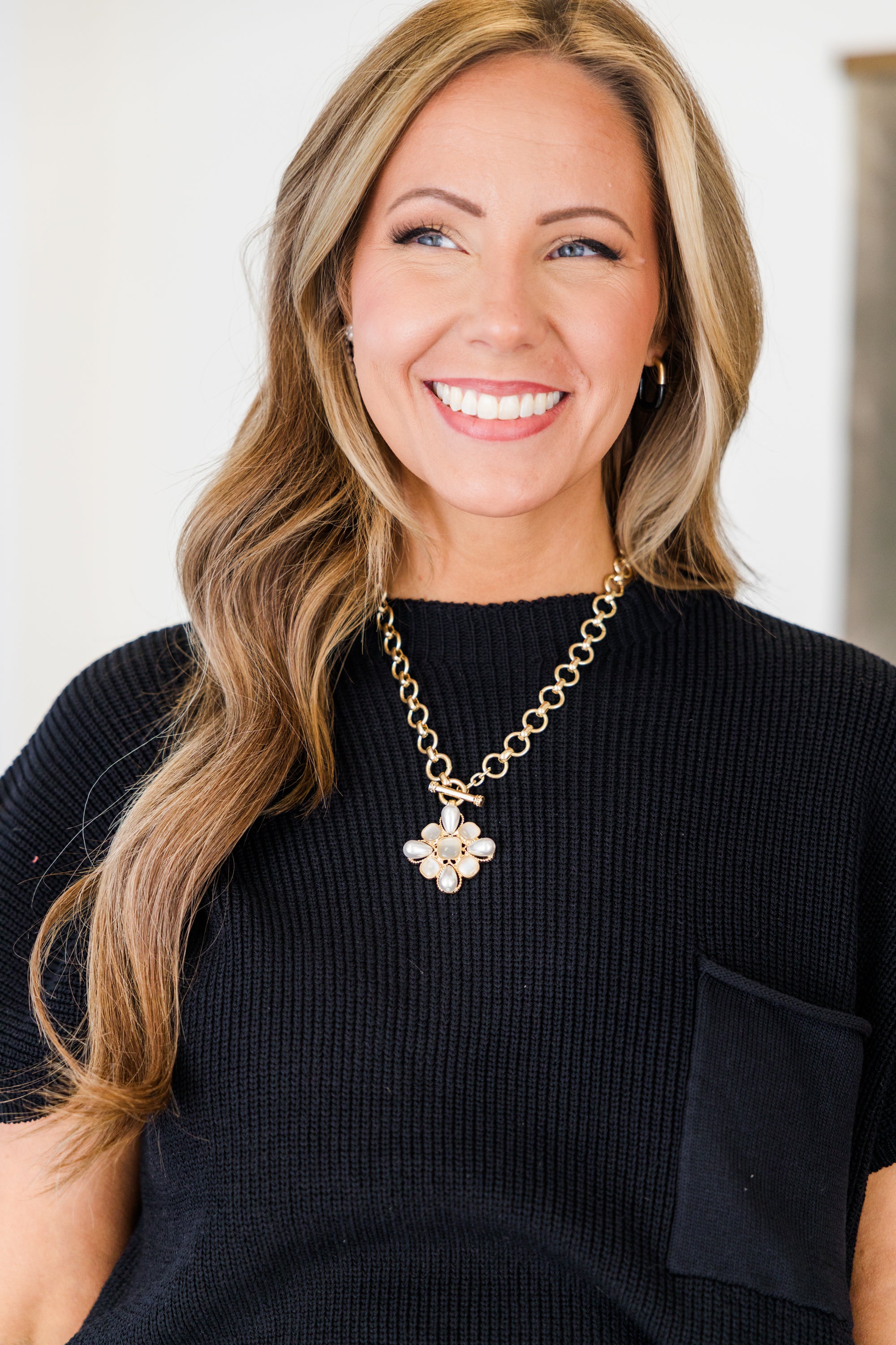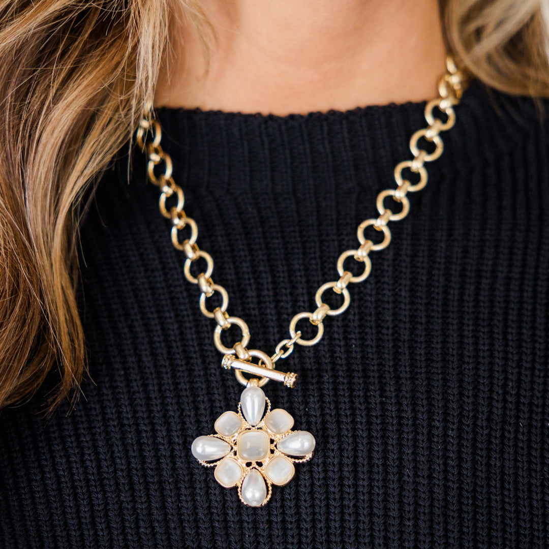 Add some vintage charm to your jewelry collection with this necklace! This gold necklace features a beautiful pearl and opal pendant, held together by a trendy toggle chain! Perfect for adding a touch of elegance to any outfit!