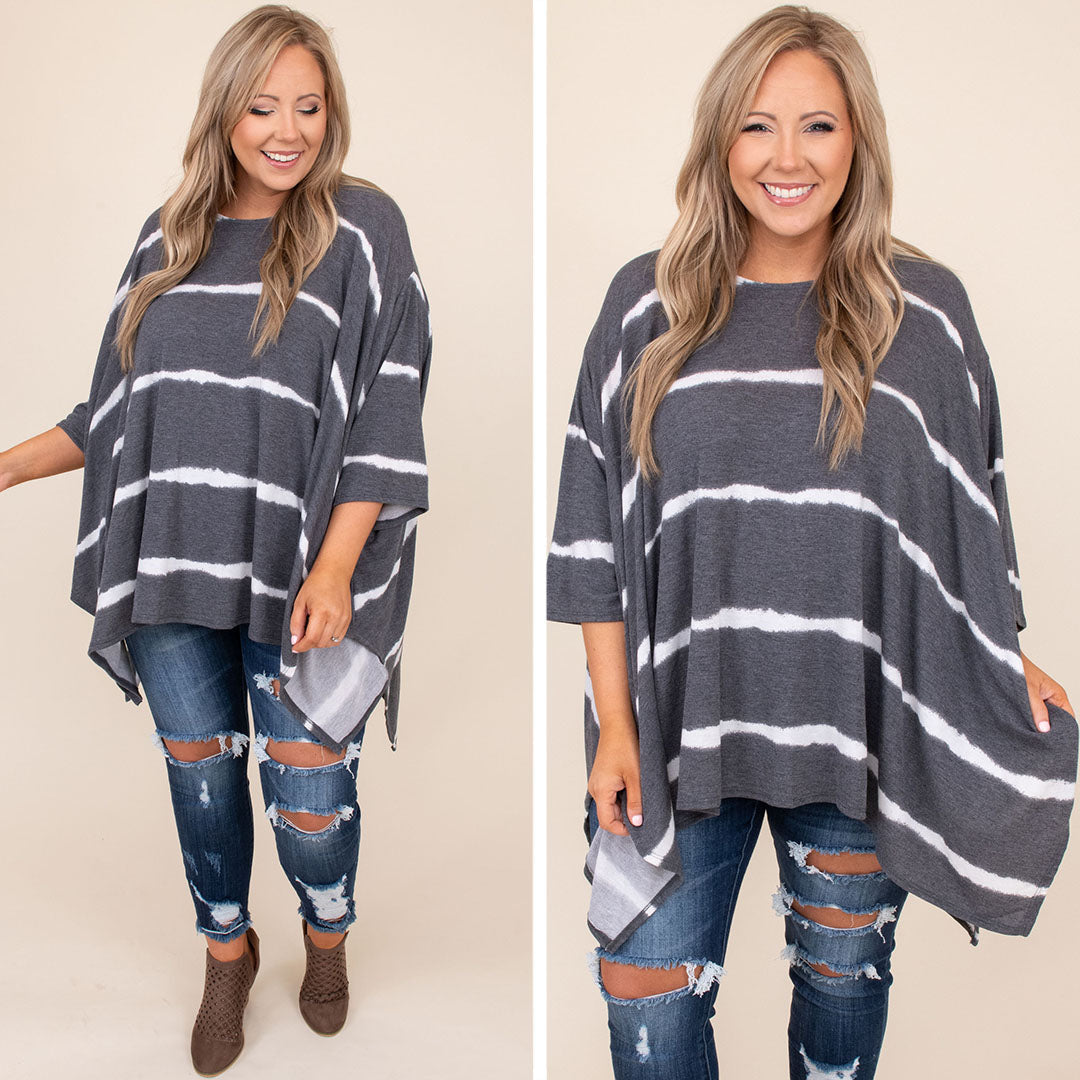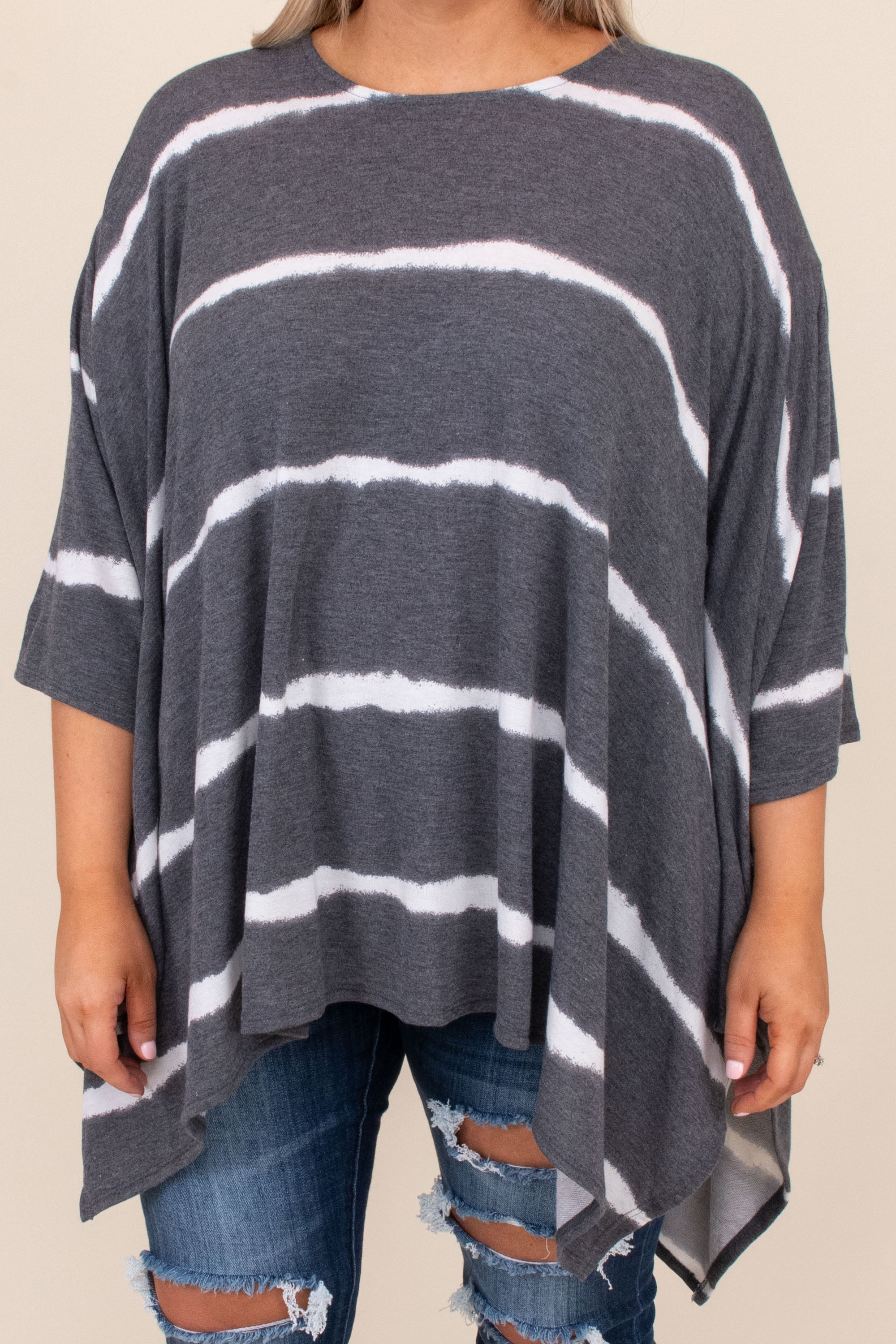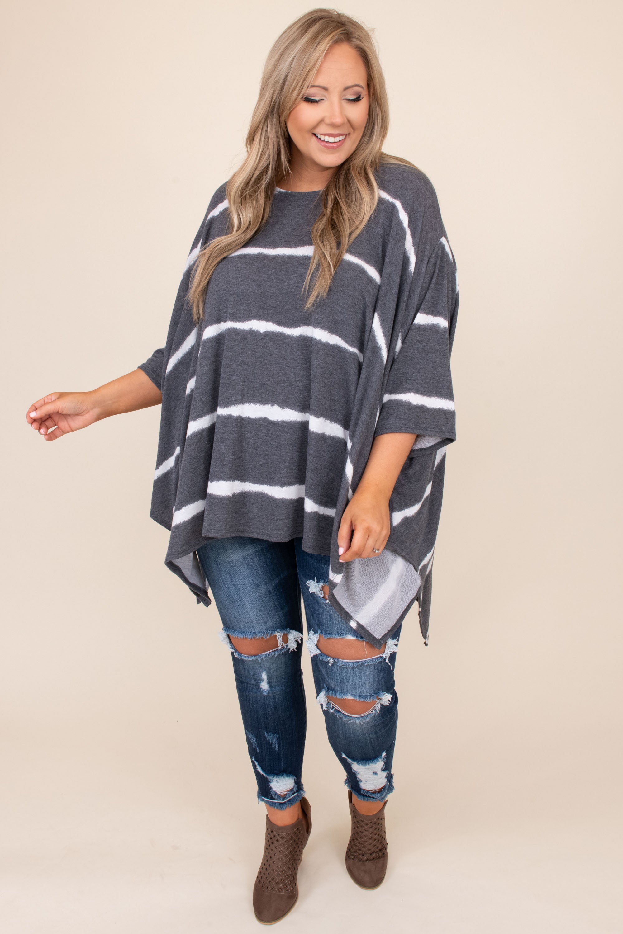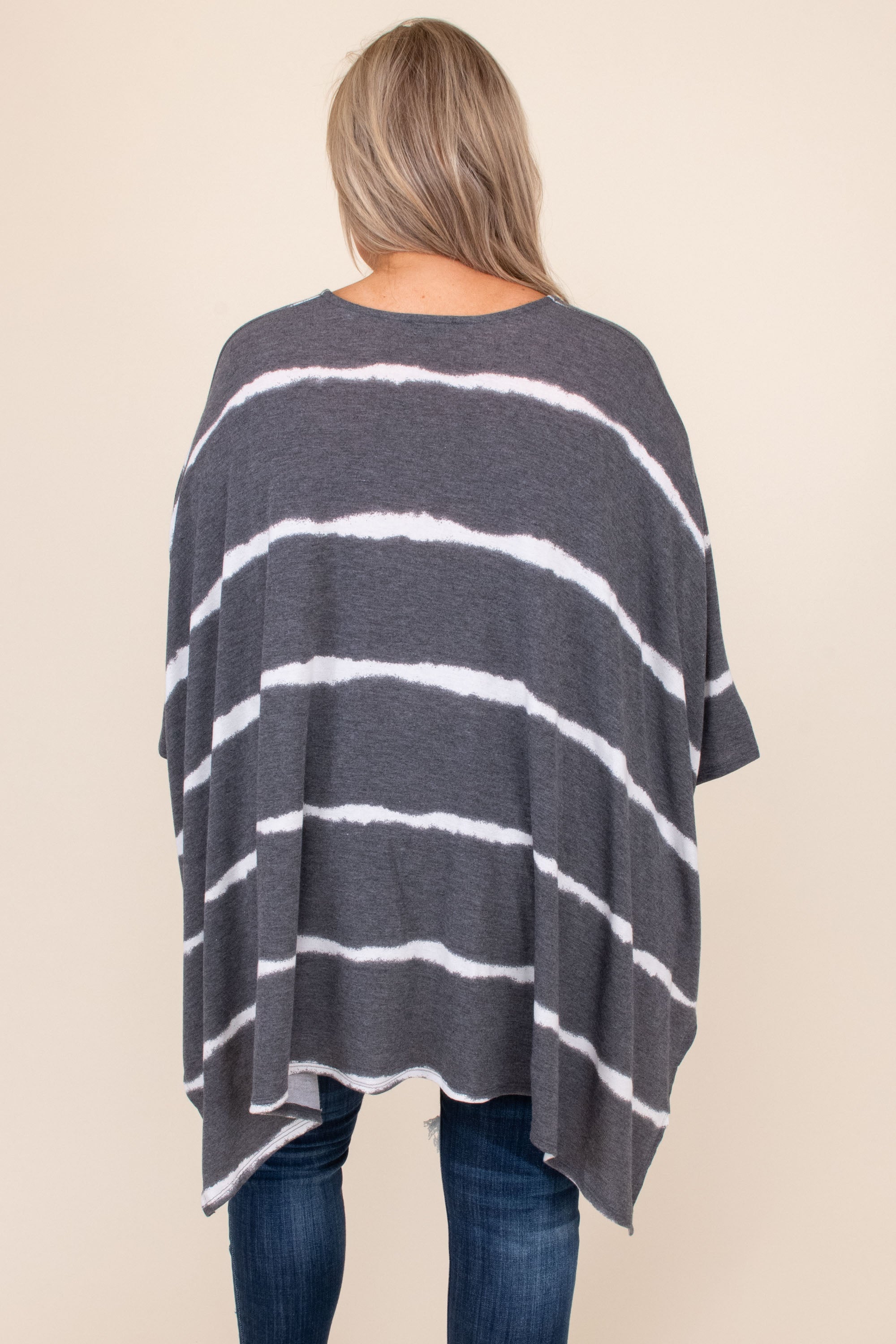 Admire the colors of the wind in this flowy tunic! It has a sleek charcoal gray color with striped detailing you can dress up or down and style with your favorite shoes and accessories! It's comfortable for all-day wear, has a figure-flattering fit, and is perfect for year-round wear! Simply pair this top with leggings or skinnies for an easy everyday look!
