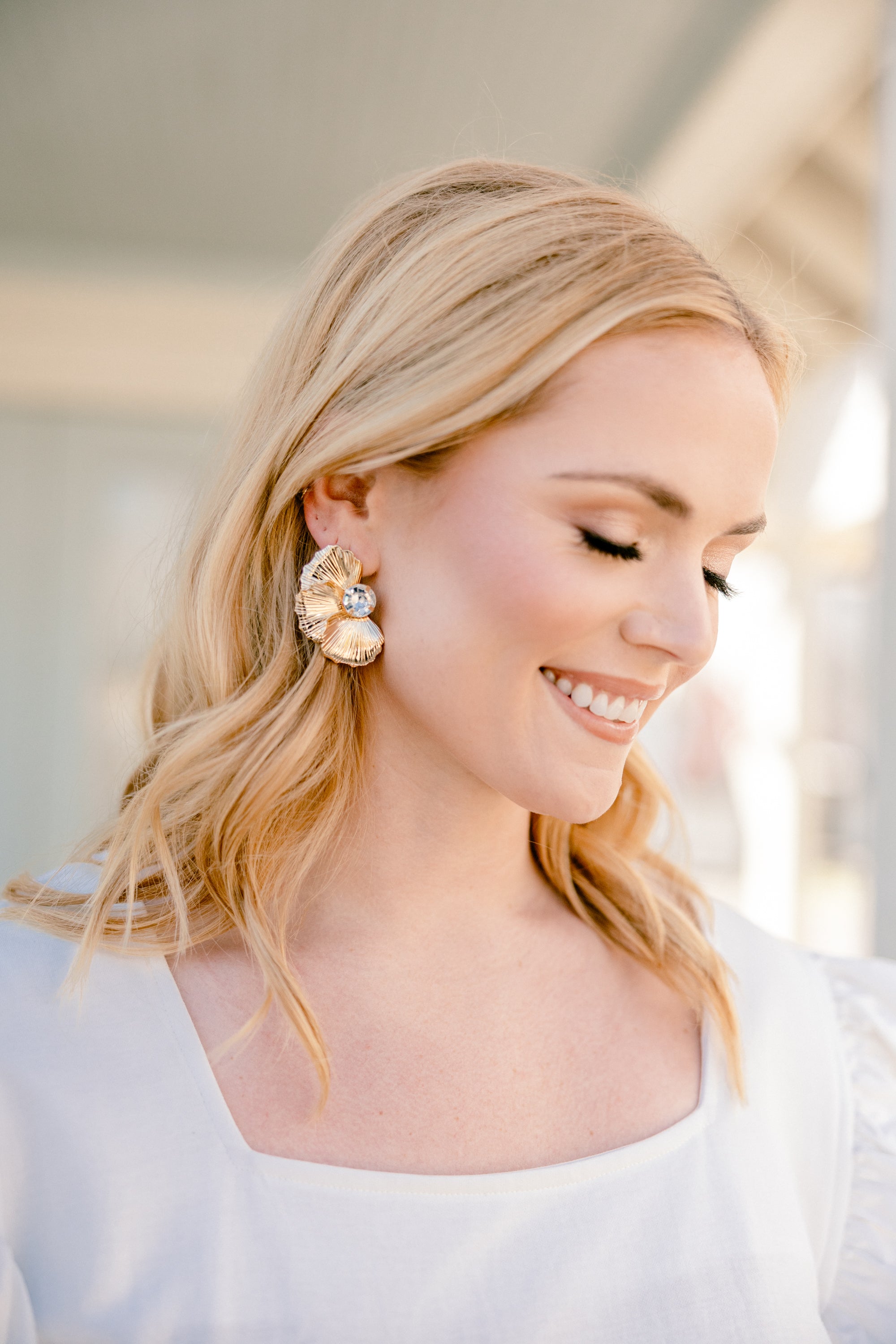 Add a touch of whimsy with these earrings! These gold tone metal flower earrings feature sparkling clear rhinestones in the center! The post backs ensure they'll stay securely in place no matter where you go! Get ready to shine and sparkle with these fun and playful earrings!