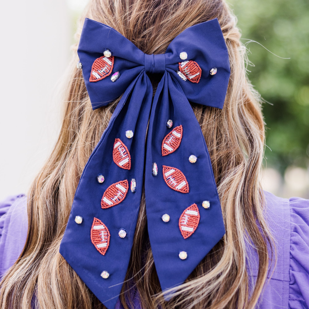 Score a touchdown with the Making My Own Luck Bow! The navy bow is adorned with beaded footballs and sparkly rhinestones, making it the perfect accessory for your game day look. Don't leave your luck up to chance, grab this playful and fun bow today!